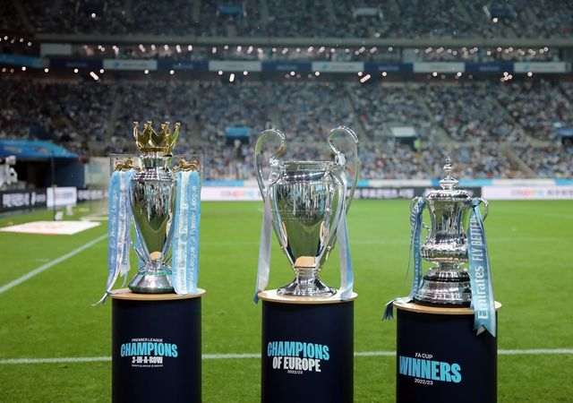 지난 30일 서울 마포구 서울월드컵경기장에서 열린 쿠팡플레이 시리즈 2차전 아틀레티코 마드리드와 맨체스터 시티 FC의 경기에 앞서 맨시티의 '트레블'을 이룬 프리미어리그, FA컵, 챔피언스리그 우승컵이 팬들에게 공개되고 있다. / 뉴스1
