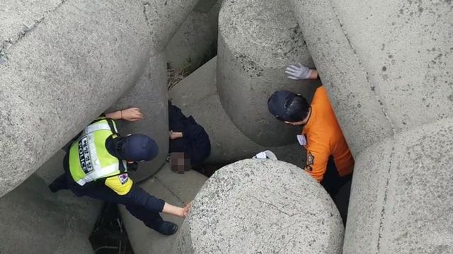 테트라포드 사이에 추락한 남성을 해경 등이 구출하는 모습. 2016년 울산해경에서 촬영한 것이다. / 이하 연합뉴스