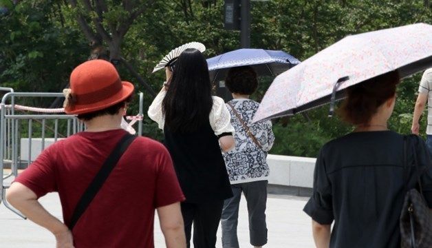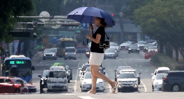 전국 곳곳에 폭염특보가 발효된 28일 오후 대구 달구벌대로에서 뙤약볕을 피해 양산을 쓴 시민이 아지랑이가 피어오르는 도로를 건너고 있다.. / 이하 뉴스1