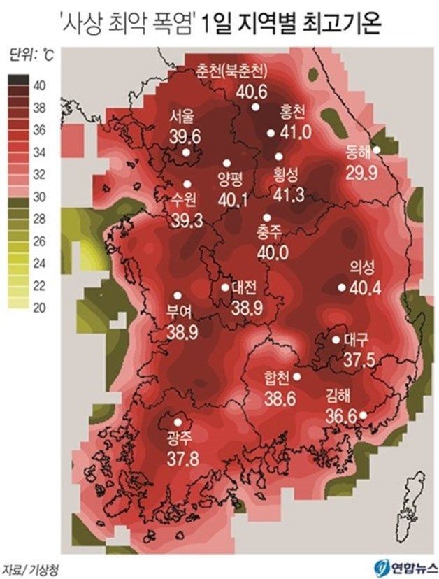 2018년 '사상 최악 폭염' 1일 지역별 최고기온. 연일 불볕더위가 계속되는 가운데 1일 우리나라의 폭염 역사가 새로 쓰였다. 기상청에 따르면 강원도 홍천의 수은주는 이날 오후 4시 정각 41.0도까지 치솟았다. 서울은 39.6도(오후 3시 36분)까지 기온이 상승했다. / 연합뉴스 제공