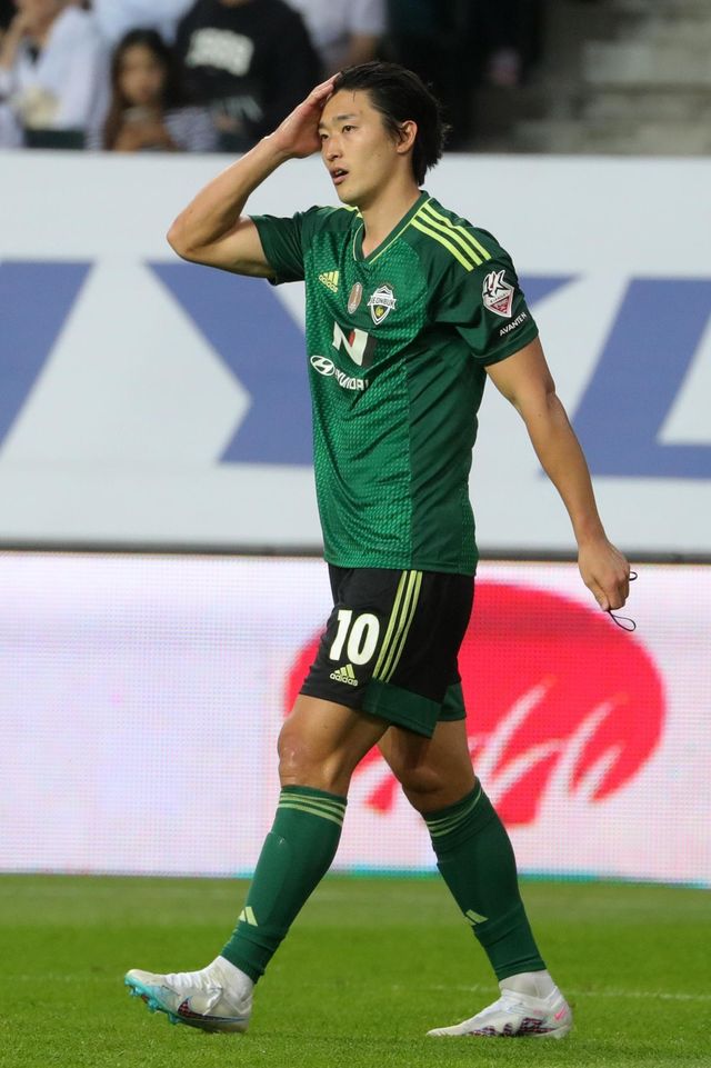 지난 5월 전북 전주시 전주월드컵경기장에서 열린 하나원큐 K리그1 전북 현대와 수원FC의 경기에서 전북 현대 조규성이 오프사이드 선언에 아쉬워 하고 있다. / 이하 뉴스1