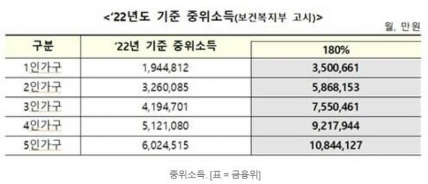 가구소득의 경우 신청자 본인을 포함한 가구원(배우자, 부모, 자녀, 미성년 형제·자매) 소득의 합이 지난해 기준 중위소득의 180% 이하여야 한다.