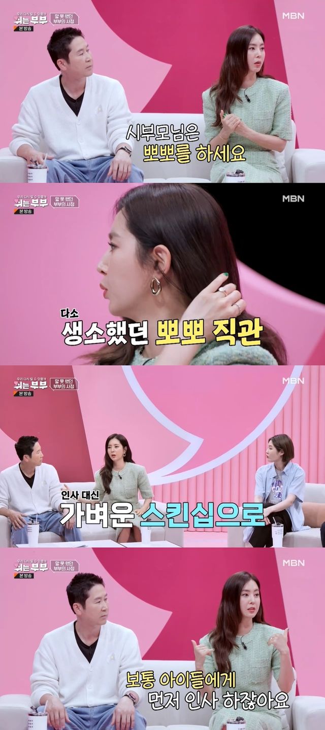 그는 "우리는, 부모는 보통 자식들한테 먼저 인사를 하는데, 두 분은 서로에게 먼저 인사를 하신다. 그래서 '우리 집이랑 약간 다르다'고 생각했는데, 남편은 그게 너무 익숙하니까 어딜 가든 사람들 앞에서 저한테 스킨십을 하려고 하더라"고 말했다.