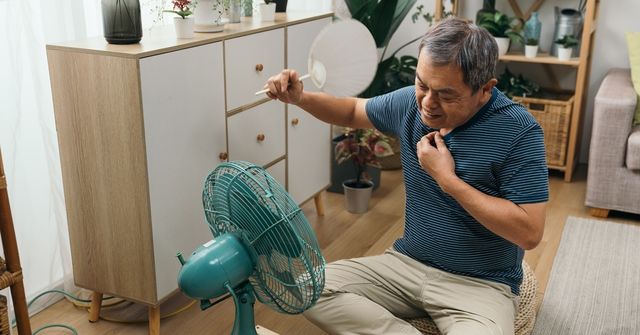 선풍기 앞에서 부채질을 하고 있는 노인 (참고 사진) /PRPicturesProduction-shutterstock.com