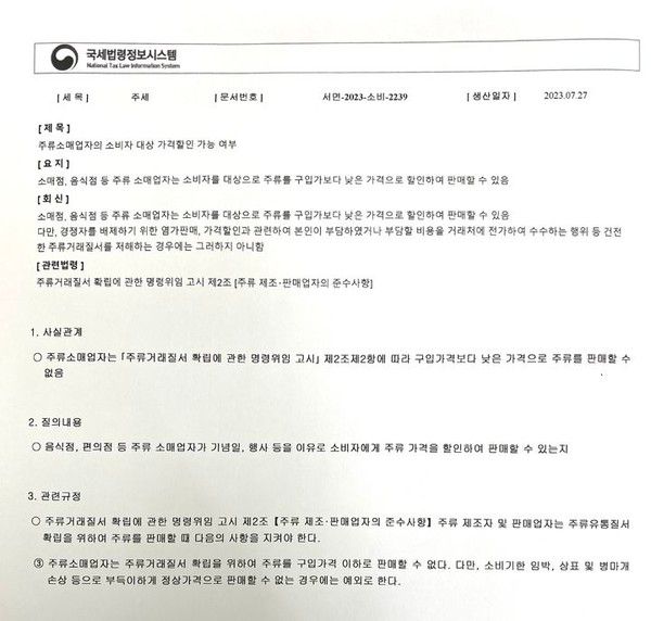 그간 이 같은 조항은 소매점의 술 할인 판매가 금지된 것으로 해석돼 왔다. 이번 국세청의 유권해석은 술 덤핑 판매, 거래처에 할인 비용 전가 등을 제외한 소매점의 주류 할인 판매는 가능하다는 유권 해석이다.