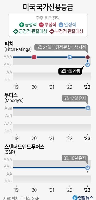피치는 이날 성명에서 미국의 신용등급 하향 조정에 대해 "향후 3년간 예상되는 재정악화, 높게 증가 중인 국가채무 부담, 부채한도를 둘러싸고 반복되는 대치 및 막판 해결에서 드러난 지배구조의 악화가 반영된 것"이라고 밝혔다.