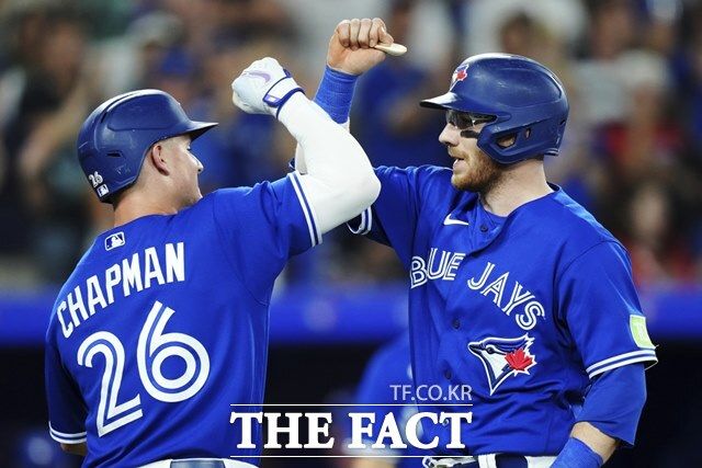 류현진과 배터리를 이룬 포수 대니 잰슨(오른쪽)은 0-3으로 뒤지던 2회 말 투런 홈런으로 '류현진 도우미'로서의 역할을 톡톡히 했다./토론토=AP.뉴시스