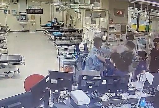 서귀포의료원 응급실에서 피의자가 응급구조사를 폭행하는 모습. 제주동부경찰서 제공