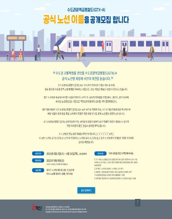 수도권광역급행철도(GTX)-A 노선명의 경우 수도권광역급행철도(GTX) A 사업에 대한 높은 국민적 기대와 관심에 부응하고, 수도권 대중교통체계를 혁신적으로 바꿀 사업의 의의 등을 고려하여 특별히 국민제안을 통해 마련할 계획이다.
