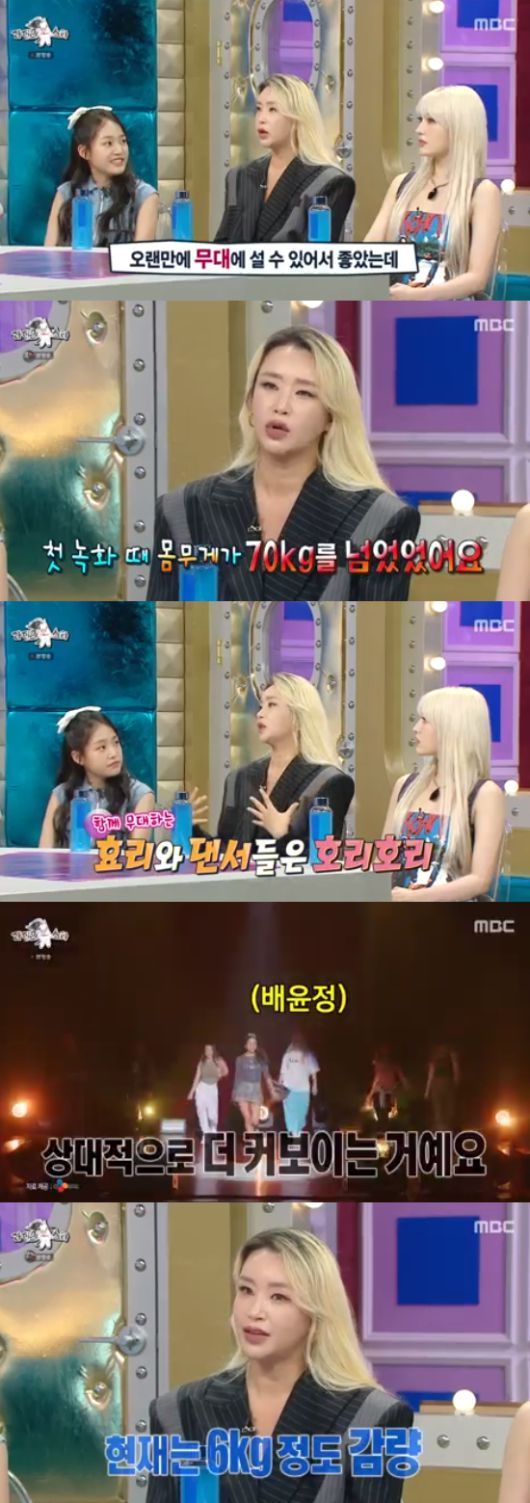 이날 배윤정은 '댄스가수 유랑단' 이효리와 무대가 언급되자 "너무 오랜만에 무대 기회가 와서 좋았지만, 첫 녹화 당시 출산 후 몸무게가 70㎏가 넘었을 때였다"고 털어놨다.