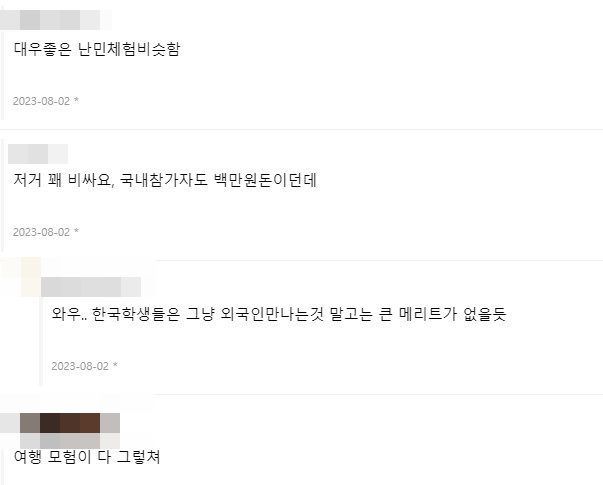 참가 비용을 본 국내 네티즌들은 “저 돈이면 초호화 한국 관광을 할 텐데”, “우리가 다 미안하다”, “저 돈 내고 난민 체험하는 거냐”, “손해배상 차원에서 한국 관광 따로 시켜줘라”, “조직위 진짜 일 못 하네”라며 댓글을 남겼다.