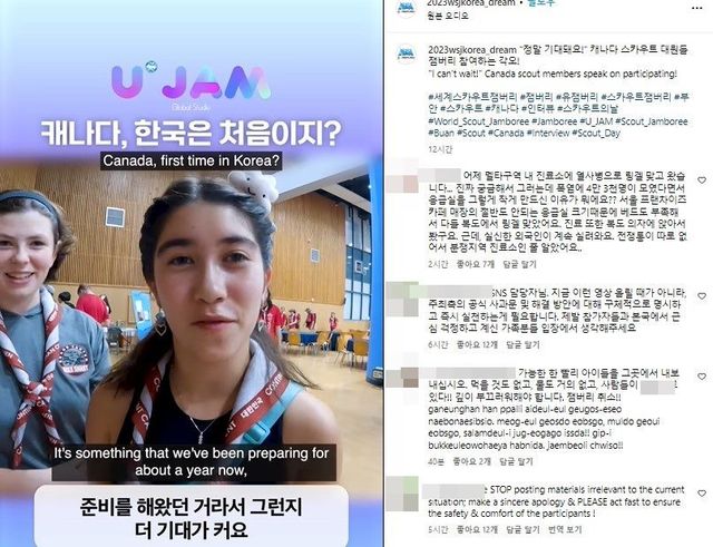 '새만금 잼버리 행사'에 대해 불편을 토로하는 참가자들 / 2023 새만금 잼버리 행사 공식 인스타그램