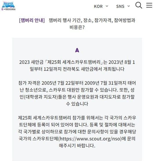 '새만금 잼버리 행사' 참가 자격 및 비용 안내 / 2023 새만금 잼버리 행사 공식 홈페이지