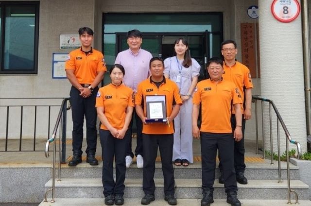 제주도광역정신건강복지센터로부터 감사패를 수여받은 구좌119센터 이은상 소방사(아래 가운데). 제주소방안전본부 제공