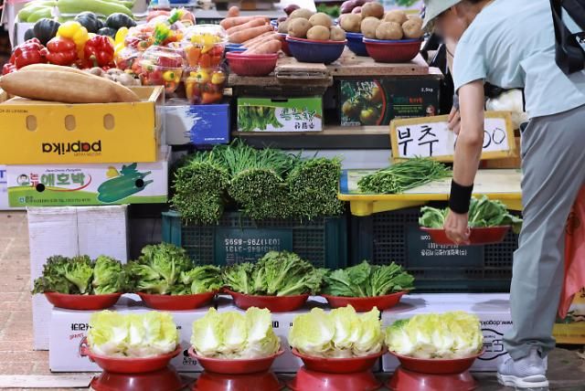 1日,首尔西大门区的一个传统市场里,市民正在选购蔬菜。【图片来源 韩联社】