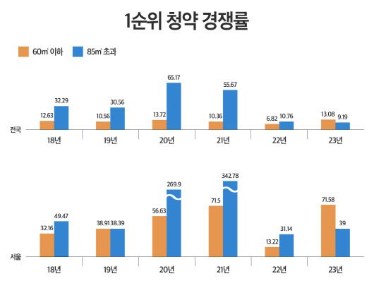 부동산인포가 부동산R114(렙스) 데이터를 분석한 결과 올 7월 기준 전국에서 전용면적(이하 전용면적) 60㎡이하 1순위 청약 경쟁률은 13.08대 1로 나타났다. 85㎡초과 9.19대 1, 60~85㎡이하 7.02대 1을 웃돌았다. 특히 서울은 60㎡ 이하가 71.58대 1을 기록해 85㎡초과 39.00대 1, 60~85㎡이하 61.67 보다 치열했다.