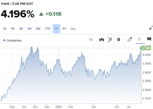 우선 연준의 긴축이 예상보다 오래될 것이라는 전망이 강해지면서 경기 침체 우려에 장기국채 매도 현상(금리 상승)이 벌어지고 있다.