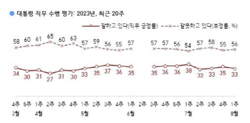 한국갤럽은 지난 1일부터 3일까지 전국 만 18세 이상 1003명을 대상으로 조사(8월 1주)한 결과 윤 대통령의 직무 수행 평가에서 ‘잘하고 있다’고 응답한 비율은 33%를 기록했다. 지난 조사(7월 4주)와 비교해 2%포인트 하락했다.