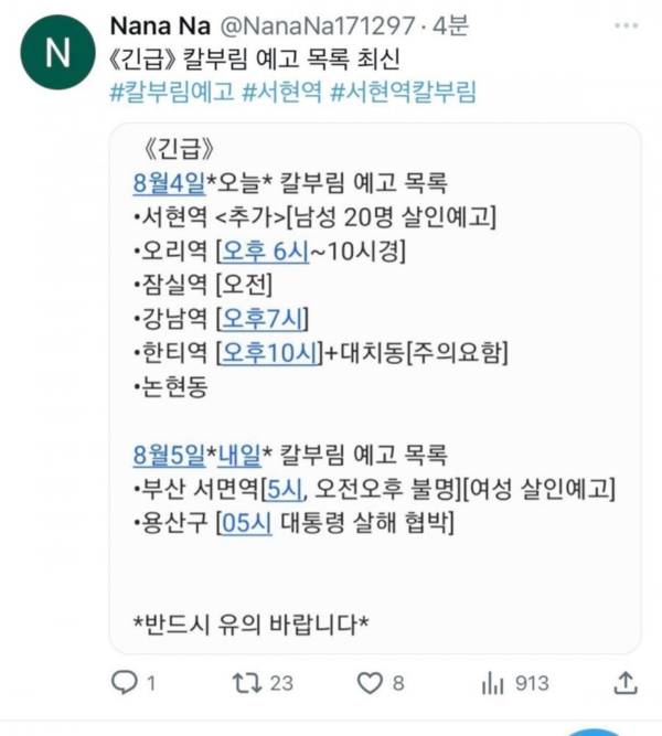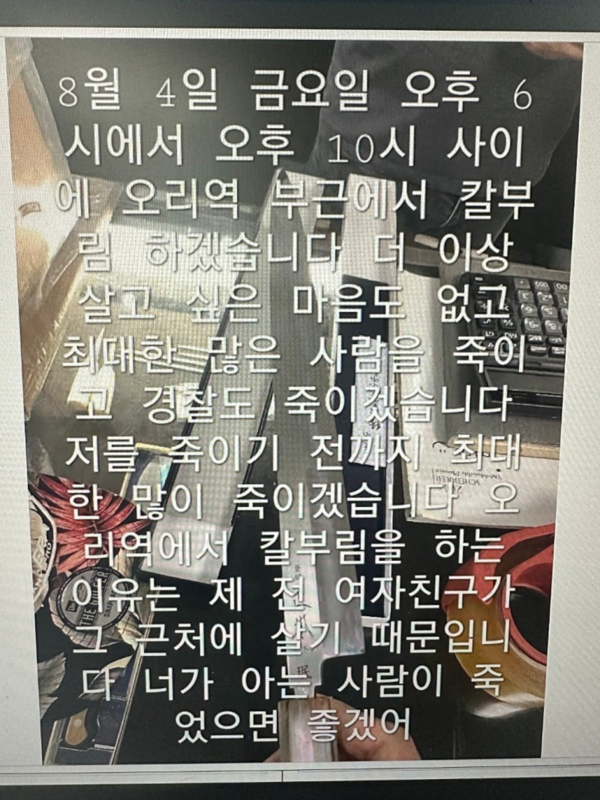 서현역 사건 이후 8월 4일 오후 6시~10시 오리역에서 무차별 살인을 예고하는 글이 텔레그램에 올라왔다는 제보가 나왔다.