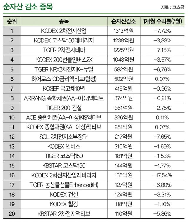 코스콤에 따르면 7월31일 기준 한 주 동안 자금 순유출이 가장 많았던 종목은 삼성자산운용 'KODEX(코덱스) 2차전지산업'으로 1359억원이 빠져나갔다. 그 뒤를 이어 5위에는 미래에셋자산운용 'TIGER(타이거) 차이나전기차 SOLACTIVE'가 같은 기간 495억원이 순유출됐다. 두 종목의 순자산총액은 각각 1조3808억원, 2조6997억원으로 국내 2차전지 관련 ETF 가운데 규모도 가장 크다.