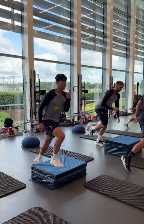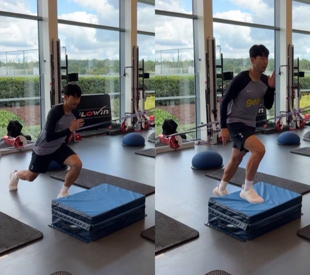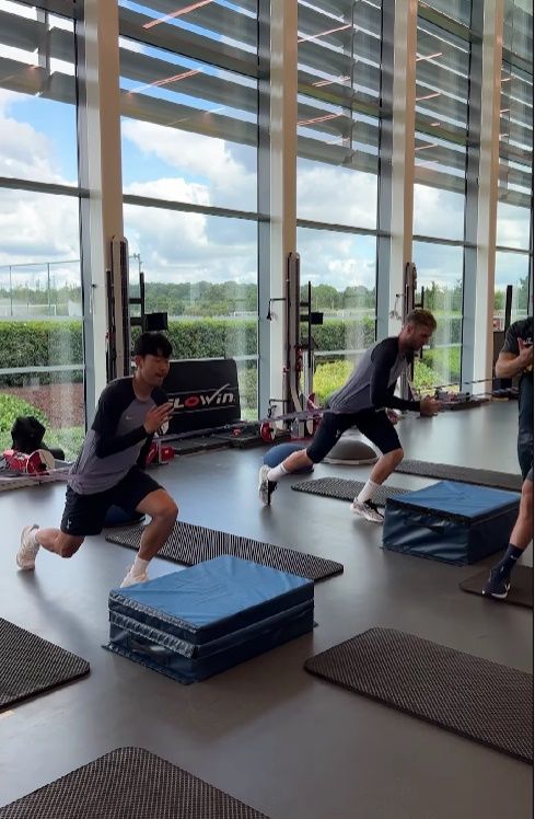 영상 속에서 손흥민은 동료들과 함께 실내 훈련장에서 하체 훈련을 진행했다. 고무줄을 허리에 감은 손흥민은 하체 운동으로 유명한 '런지(Lunge)'운동을 소화했다. 이때 다리를 굽힌 후 일어나는 과정에서 오른발을 단번에 앞에 놓인 스텝박스 위에 올려놓았다.