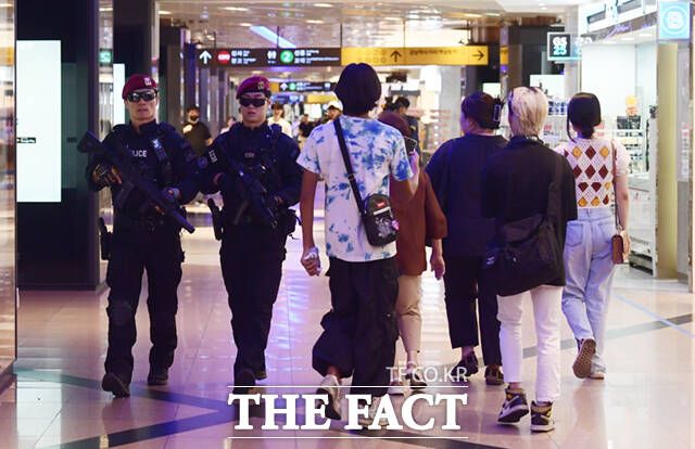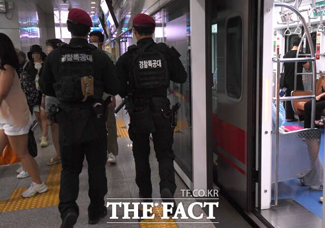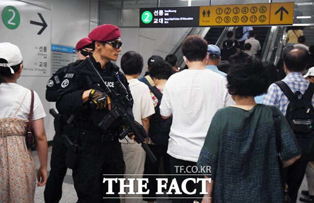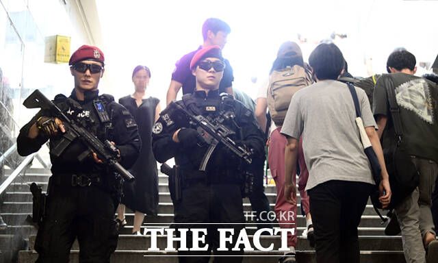 5일 오전 서울 강남역 지하쇼핑센터에서 무장한 경찰특공대원들이 순찰을 하고 있다.