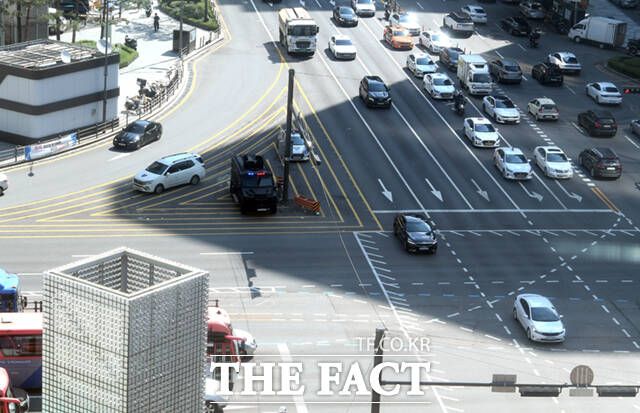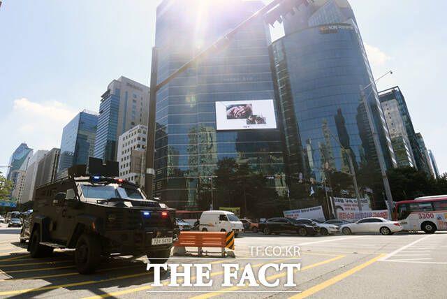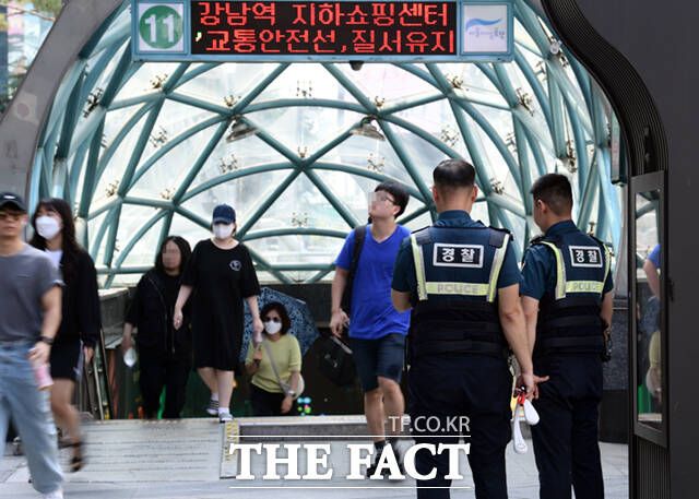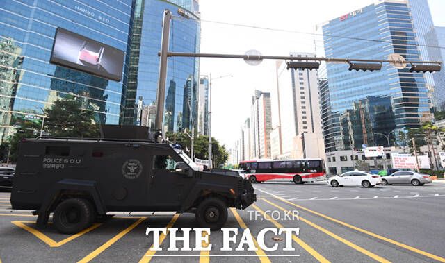 [더팩트ㅣ이새롬 기자] 서현역 흉기난동 사건 이후 전국 곳곳에서 비슷한 범행을 예고하는 글이 잇따르는 가운데 5일 오전 범행 예고지 중 한 곳인 서울 강남역 사거리에 전술 장갑차가 배치되고, 무장한 경찰특공대원들이 강남역 일대를 순찰하고 있다.