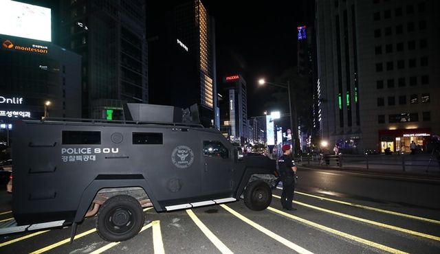 서울시 강남구 지하철 강남역 인근에 경찰특공대와 전술장갑차가 배치돼 있다. / 뉴스1