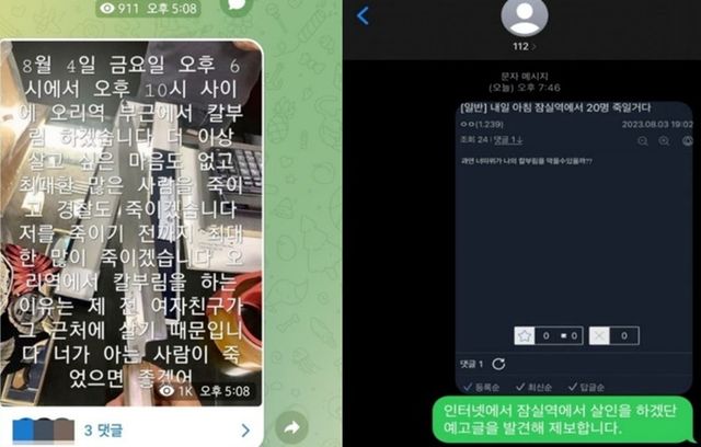 온라인 상에 올라온 살인 예고글 / 온라인커뮤니티