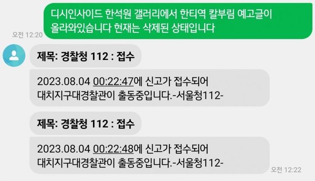 지난 4일 디시 인사이드 한석원 갤러리에 한티역에서 범죄 예고글을 올렸다 신고를 당한 네티즌은 같은 날 오후 6시경 “정말 죄송합니다. 어제 10시쯤 신림역 사건에 이어 또다시 칼부림 사건이 일어나 평소처럼 아무 생각 없이 글을 작성했다”며 뒤늦은 반성문을 올렸다.