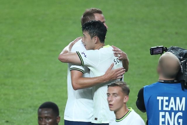 토트넘 홋스퍼 해리 케인과 손흥민이 지난해 7월 13일 서울 마포구 상암동 서울월드컵경기장에서 열린 쿠팡플레이시리즈 팀 K리그와의 경기에서 6대 3으로 승리한 뒤 포옹하고 있다. / 이하 뉴스1
