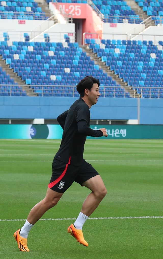 손흥민이 엘살바도르와의 평가전을 앞둔 지난 6월 19일 대전 유성구 대전월드컵경기장에서 훈련하고 있다.