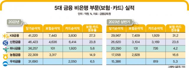 보험과 카드는 영업환경 악화 속에서도 5대 금융지주 비은행 계열사의 핵심축 역할을 하고 있다는 평가를 받는다. 각사에 따르면 올 상반기 5대 금융지주의 당기순이익에서 보험·카드 등 비은행 부문이 차지하는 비중은 평균 49.6%로 지난해 46.4%보다 3.5%포인트(p) 상승했다.