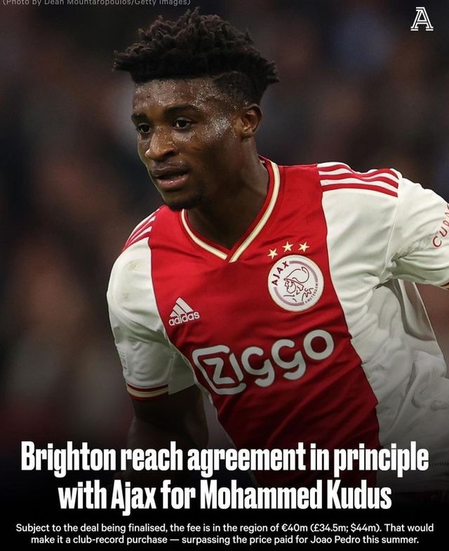 영국 ‘디 애슬래틱’의 데이비드 온스테인 기자는 6일(한국시간) “브라이튼은 공격형 미드필더 쿠두스를 영입하기로 원칙적 합의를 했다. 이적료는 4,000만 유로(약 575억 원)다. 올여름 주앙 페드로에게 지불한 금액 이상이다. 브라이튼에 기록적인 구매가 될 것이다. 쿠두스 이적은 로베르토 데 제르비 감독이 주도했다. 쿠두스는 아약스를 떠나기를 원한다”고 전했다.