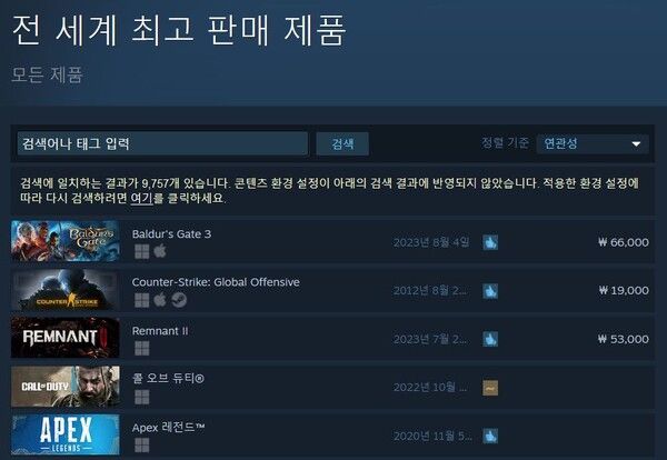 판매량 순위에서도 ‘발더스 게이트3’의 이례적인 수준의 인기를 돋보이게 만드는 지표가 존재한다. 국가별 판매량 순위에서도 게임은 대부분 1위를 기록 중인 가운데, 이는 국내 역시 마찬가지인 상황이다. 다만, 게임이 한국어 공식 자막을 지원하지 않고 있다는 점이 특기할 사항으로, 언어 장벽마저 넘어선 ‘발더스 게이트3’의 인기를 잘 확인시켜주고 있다.