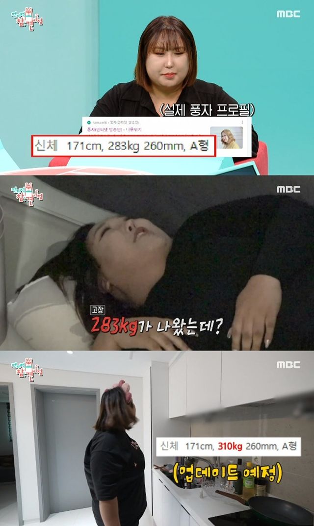 풍자는 지난 방송에서 몸무게를 쟀다가 283kg으로 측정돼 모두를 경악하게 만든 바 있다. 당시 풍자는 "체중계가 고장이 잘 난다. 내 프로필에도 몸무게가 283kg으로 적혀있다"라고 속상해하기도.