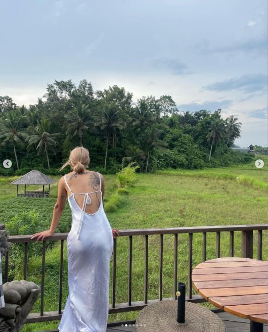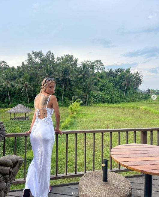 사진 속 황보는 인도네시아 발리에서 포즈를 취하고 있다. 반짝이는 드레스는 등을 노출한 디자인이다.