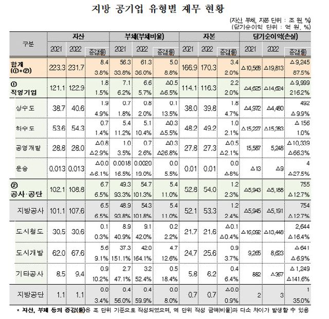 2022년 지방 공기업의 재무 현황을 보면 자산 231조7000억 원, 자본 170조4000억 원, 당기순손실 1조9000억 원, 부채 61조3000억 원을 기록했다. 다만 부채 비율은 지난 2018년부터 지난해까지 5년 간 각각 37.3%, 34.4%, 34.9%, 33.8%, 36.0%의 30%대로 안정적으로 유지되고 있는 것으로 집계됐다.
