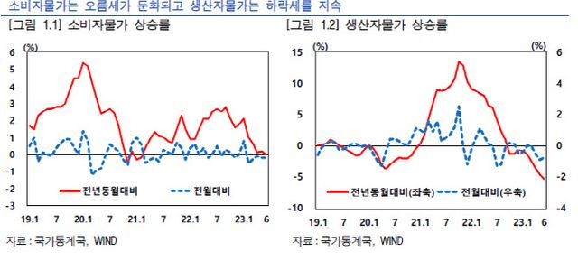 중국의 6월 소비자물가지수(CPI) 상승률은 전년동월대비 0%로 2021년 2월 이후 최저치로 떨어졌다. 중국의 CPI 상승률은 지난 3월 이후 4개월 연속 0%대에 머물고 있다. 생산자물가의 경우 6월 -5.4%를 기록, 작년 10월(-1.3%) 이후 9개월 연속 하락세를 보이고 있다.