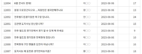 또 다른 작성자는 "전북 현대라는 팀이 시즌을 치르고 있고 축구는 잔디관리가 무엇보다 우선이고 대단히 중요한데 콘서트를 하면 잔디가 엄청 망가진다"며 "다른 곳에서 콘서트를 했으면 좋겠다. 축구 팬들이 무조건 양보하는 이런 방식은 아닌 거 같다"고 적었다.