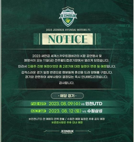 전북현대모터스는 지난 6일 공식 사회관계망서비스(SNS)를 통해 "2023 새만금 세계스카우트 잼버리의 K팝 공연 행사 및 폐영식이 오는 11일 전주월드컵경기장에서 열리게 됐다"며 "다음 주 진행 예정이었던 홈 2경기에 대한 일정이 변경될 예정"이라고 밝혔다.