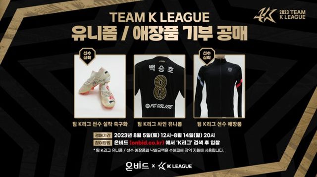 [인터풋볼] 박지원 기자= 한국프로축구연맹(총재 권오갑, 이하 “연맹”)과 한국자산관리공사(사장 권남주, 이하 “캠코”)가 5일(토)부터 14일(월)까지 10일간 팀 K리그 선수들의 유니폼 및 애장품 기부 경매를 진행한다.