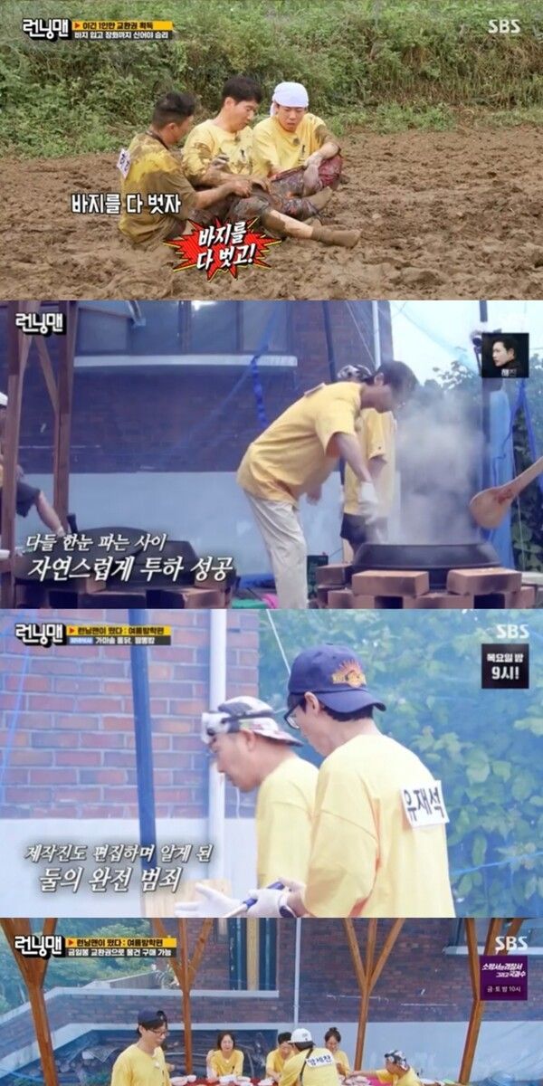 이날 방송은 지난주에 이은 '런떴' 여름방학 편으로 꾸며져 더 강렬한 웃음을 선사했다. 금일봉 교환권을 건 진흙탕 싸움에서는 유재석, 김종국, 송지효가 나란히 교환권을 얻었고, 제작진은 패배자인 지석진과 양세찬, 하하 세 사람에게 패자부활전의 기회를 줬다. 세 사람은 예상대로 진흙탕 싸움을 이어가 웃음을 안겼고, 양세찬이 교환권을 차지했다.