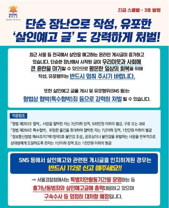 이 때문에 발령된 이번 긴급 스쿨벨 3호는 살인예고 글 게시가 이웃과 사회에 극도의 불안감을 조성하기 때문에 평온한 일상을 되찾기 위해 유포행위를 멈춰달라는 메시지를 담고 있다. 아울러 이 같은 게시 행위는 협박죄(특수협박죄) 등으로 강력하게 처벌되고, 이를 볼 경우 112로 신고해 달라는 내용도 담겼다.