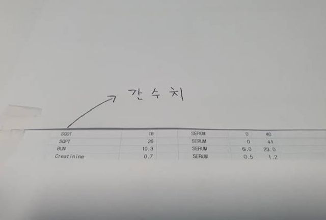 공개된 검사지를 보면 AST(아스파테이트아미노전이효소 혈중 농도 측정값)은 18IU/L, ALT(알라닌아미노전이효소 혈중 농도 측정값)은 26IU/L로 정상 범위다.