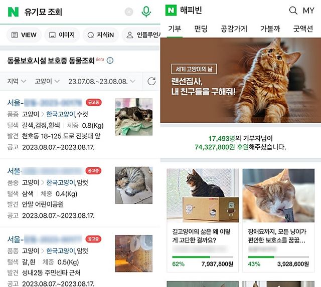 네이버에서 마련한 '유기묘 조회' 서비스와 모금 캠페인