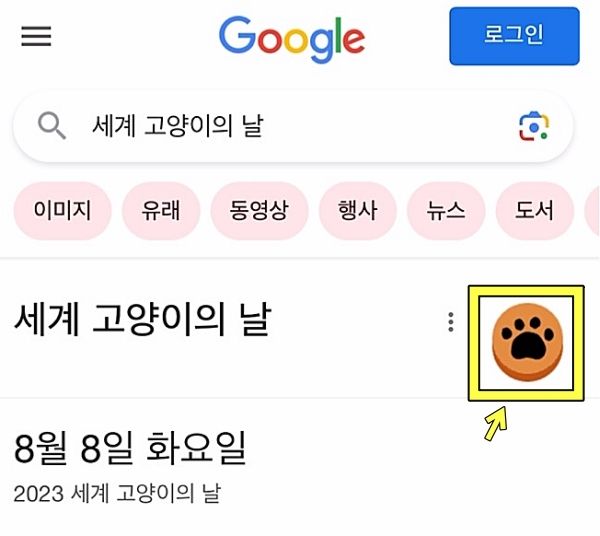 8일 구글에 '세계 고양이의 날'을 검색하면 뜨는 화면. 고양이 발자국 그림(노란 네모 표시)을 누르면 고양이 발이 등장하는 것을 볼 수 있다. / 이하 구글