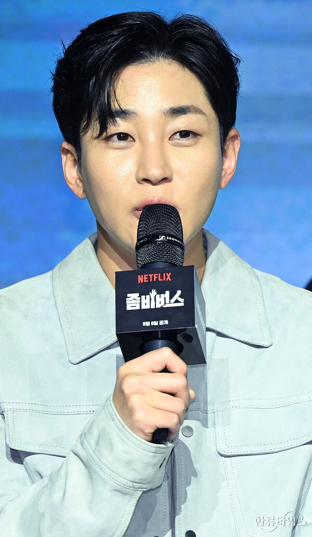 가수 딘딘이 8일 오전 서울 마포구 호텔 나루 서울 엠갤러리에서 열린 넷플릭스 오리지널 예능프로그램 ‘좀비버스’ 제작보고회에 참석해 취재진의 질문에 답하고 있다.