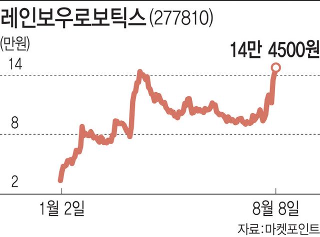 8일 마켓포인트에 따르면 로봇 테마 대장주인 레인보우로보틱스(277810)는 전 거래일 대비 2.06%(2900원) 오른 14만3900원에 장을 마감하며 3거래일 연속 상승세를 이어갔다. 전날 장중 15만3400원까지 오르며 52주 신고가를 경신한 데 이어 이날은 종가기준 연고점을 갈아 치웠다. 레인보우로보틱스가 14만원대에 종가를 형성한 것은 지난 3월23일 이후 약 4개월 만이다. 시가총액은 2조7818억원 수준까지 늘어나며 3조원대인 코스닥 시총 상위 10위권을 다시 노려볼 수 있게 됐다.