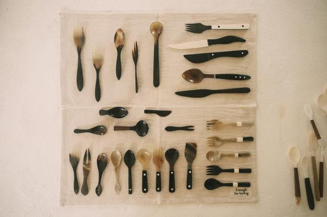 이너프 포 라이프의 핸드 메이드 제품들. 자개나 호른 재료로 깎아 만든 커트러리, 대나무로 짠 바구니, 재생유리를 입으로 불어 만든 핸드 블로운 글라스 등 오랜 시간 정성 담아 제작한 저의 베이비들이요. 조금 팔불출일 수도 있지만 제 브랜드라 애착이 많이 갈 수밖에요!